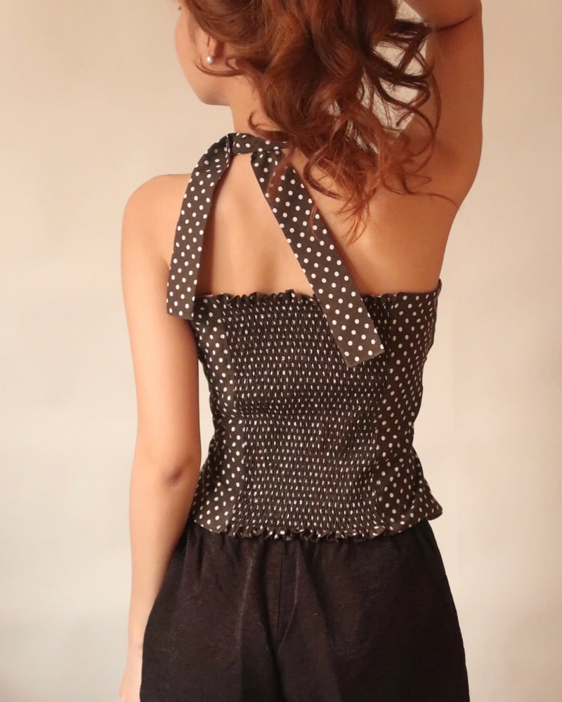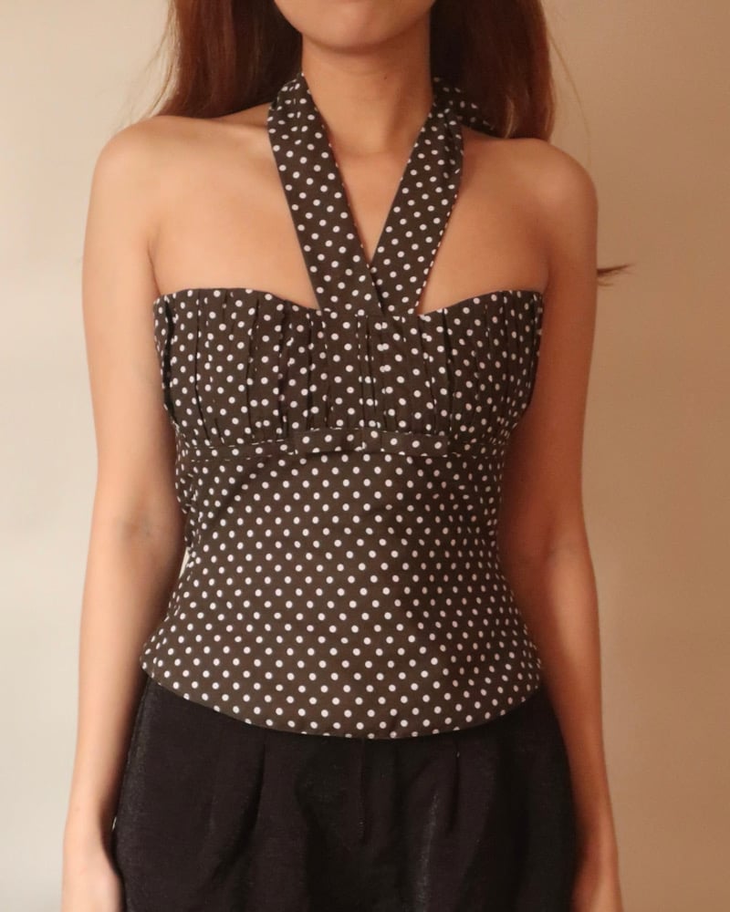 Designed with a flattering sweetheart neckline and pleated front detail — this polka dot halter top is your new go-to for day-to-night looks.