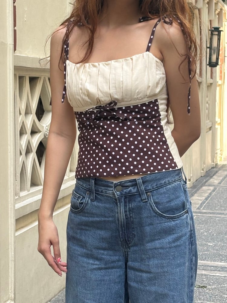 Featuring a soft cream pleated bust and a rich chocolate brown bodice dotted with crisp white polka dots, this cami is all about nostalgic femininity.