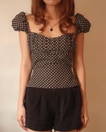 The Valentine Top features a cap sleeve with tie on ribbons, a sweetheart neckline, and a fixed ribbon detail on the center.