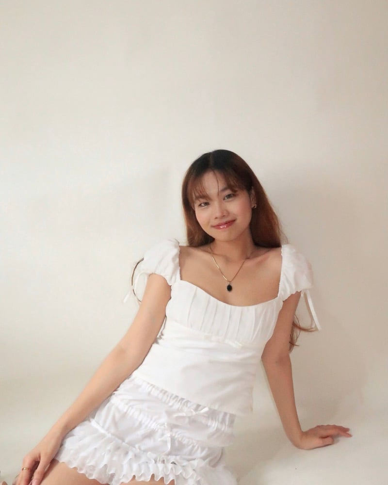 The Valentine Top features a cap sleeve with tie on ribbons, a sweetheart neckline, and a fixed ribbon detail on the center.